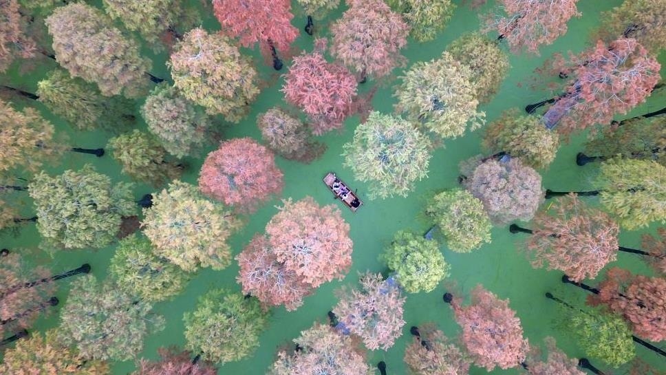 江蘇揚(yáng)州,游客在淥洋湖濕地公園的“水上森林”游玩。初冬時(shí)節(jié)的“水上森林”層林盡染,色彩斑斕,美景如畫。