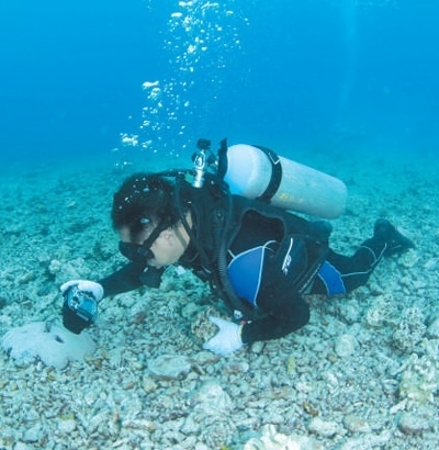 海南南海熱帶海洋研究所所長(zhǎng)陳宏在珊瑚移植前進(jìn)行海底環(huán)境調(diào)查。 于志龍攝