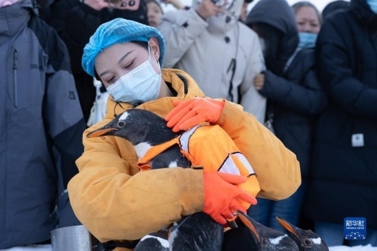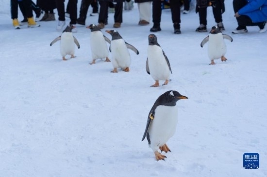 12月3日,在哈爾濱極地公園戶外冰雪巡游的企鵝吸引游客圍觀。