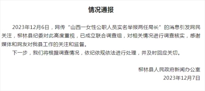 ·山西女子實名舉報兩任局長受賄玩弄女性,柳林縣紀(jì)委:已經(jīng)成立聯(lián)合調(diào)查組。