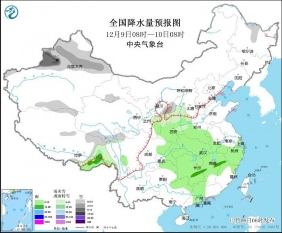 12月9日08時至10日08時,新疆北疆和南疆盆地南部、西藏北部和東部、青海南部、甘肅西部、寧夏東部、陜西西北部、黑龍江北部等地部分地區(qū)有小到中雪或雨夾雪,其中,新疆沿天山地區(qū)和伊犁河谷、陜西北部等地部分地區(qū)有中到大雪,新疆伊犁河谷等地局地暴雪(10~12毫米)。西藏東南部、陜西中南部、黃淮西部、江淮西部、江漢、江南大部、西南地區(qū)東部、華南北部等地部分地區(qū)有小雨,局地中雨。黑龍江東北部部分地區(qū)有4~6級風。