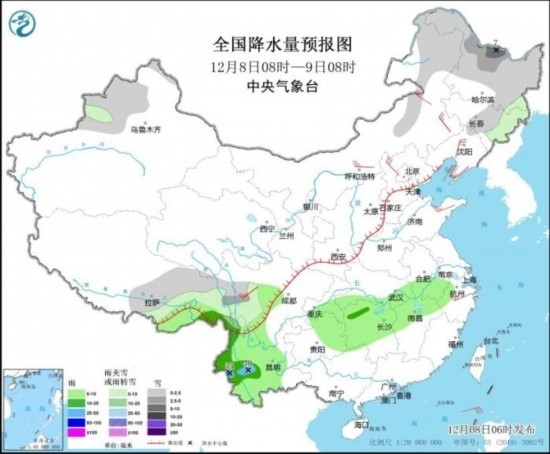 全國降水量預報圖(12月8日08時-9日08時)
