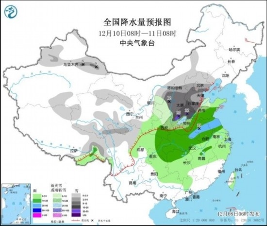 12月10日08時至11日08時,新疆沿天山地區(qū)和伊犁河谷、內(nèi)蒙古河套地區(qū)、西藏北部和東部、川西高原北部、西北地區(qū)中部和東北部、華北、黃淮北部等地部分地區(qū)有小到中雪或雨夾雪,其中,新疆沿天山地區(qū)、陜西北部、山西中南部、河北中南部、北京西南部、天津南部、山東西北部、河南北部等地部分地區(qū)有大到暴雪或雨夾雪,局地大暴雪(20~22毫米)。西北地區(qū)東南部、黃淮中南部、江淮、江漢、江南大部、西南地區(qū)東部、華南北部、臺灣島等地部分地區(qū)有小到中雨,其中,河南南部和西部、安徽北部、江蘇北部、湖北北部等地部分地區(qū)有大雨(25~35毫米)。黑龍江東北部部分地區(qū)有4~6級風。