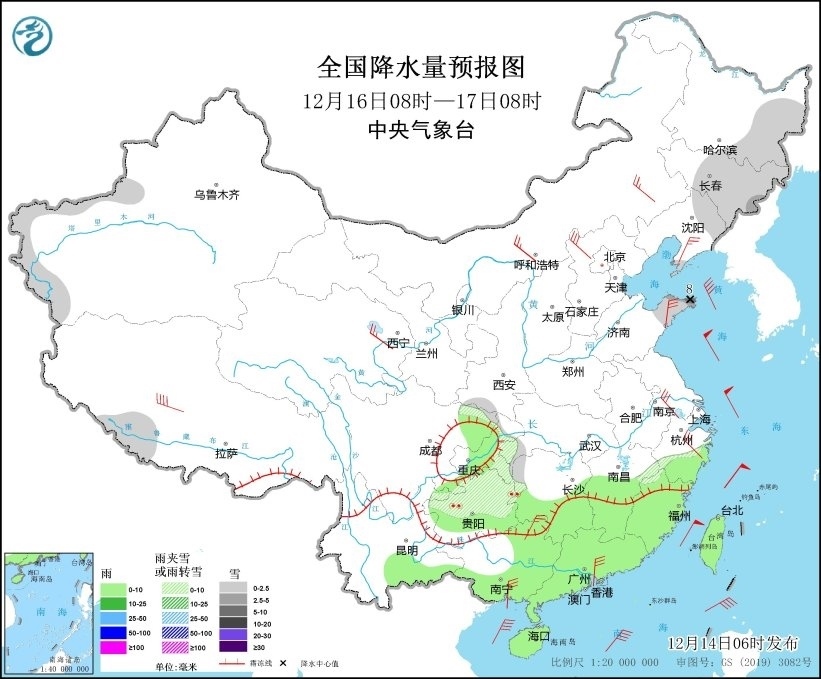 12月16日08時(shí)至17日08時(shí),新疆南疆西部山區(qū)、黑龍江東部、吉林大部、遼寧東北部和遼東半島、山東半島、重慶東部、貴州中北部等地部分地區(qū)有小到中雪或雨夾雪,其中,山東半島北部等地部分地區(qū)有大雪(5~8毫米)。貴州等地局地有凍雨。江南中南部、四川盆地東部、華南大部等地部分地區(qū)有小雨。內(nèi)蒙古中東部、遼東半島、華北北部、山東半島、江南東部、華南沿海地區(qū)等地部分地區(qū)有4~6級(jí)風(fēng)(見圖7)。