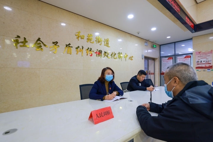 12月8日,在天津市紅橋區(qū)和苑街道社會(huì)矛盾糾紛調(diào)處化解中心,金牌調(diào)解員在詢(xún)問(wèn)群眾調(diào)解需求。