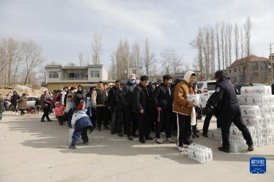 12月19日,在甘肅臨夏積石山縣大河家鎮(zhèn)大河村安置點,受災(zāi)群眾領(lǐng)取礦泉水。