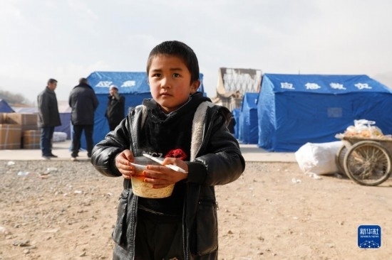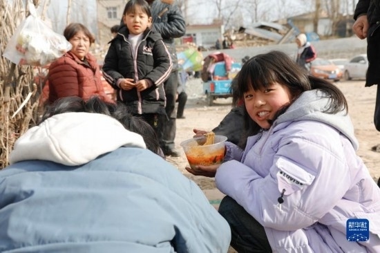 12月19日,在甘肅臨夏積石山縣大河家鎮(zhèn)大河村安置點,小朋友在吃愛心牛肉面。