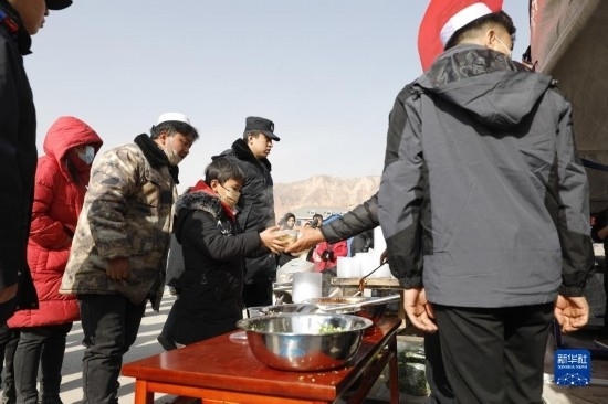 12月19日,在甘肅臨夏積石山縣大河家鎮(zhèn)大河村安置點,受災(zāi)群眾領(lǐng)取愛心牛肉面。