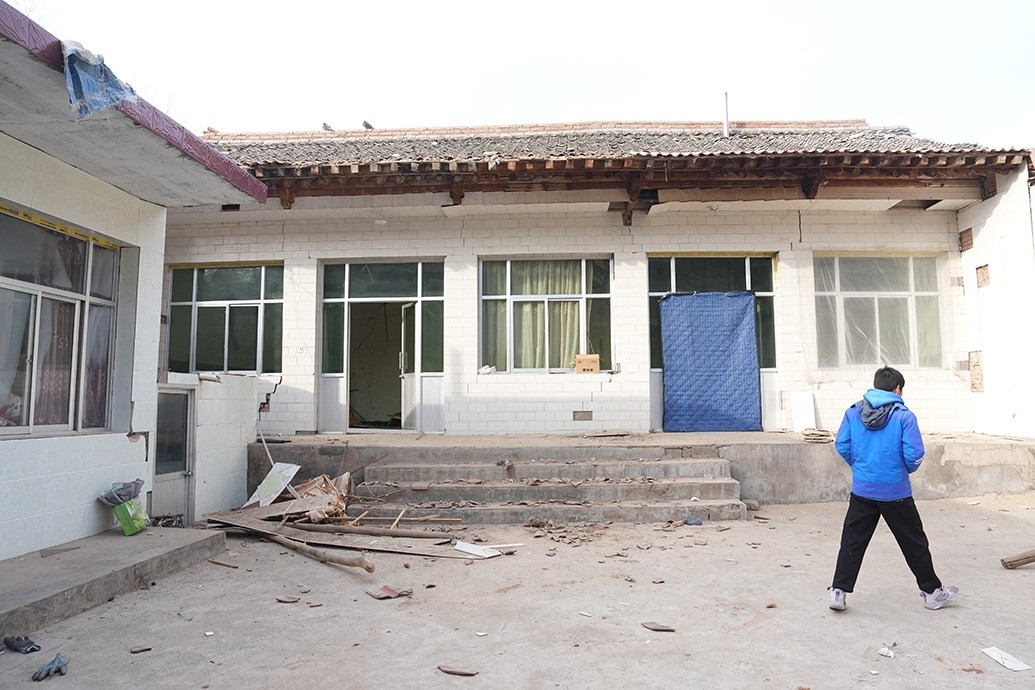 震后,他家木頭架構(gòu)的屋頂傾斜了些,磚瓦墻多處開裂,土炕也裂了,柴火的煙從裂縫滲出,有些嗆人。原則上,他家是不能再進入了,但上課的話,房間更舒適暖和點。