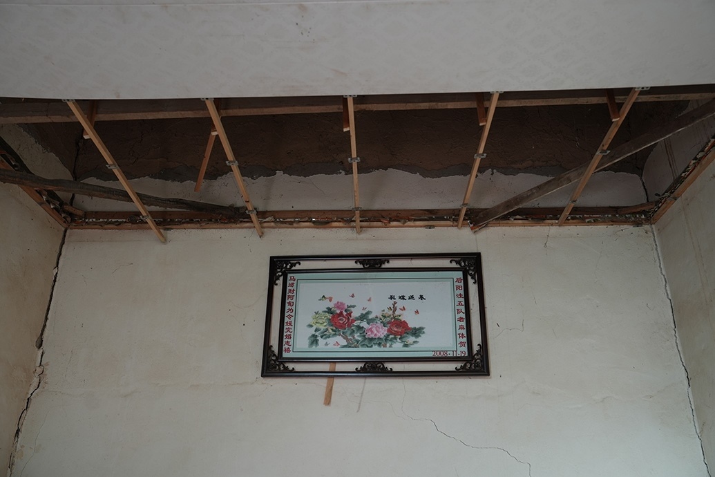 12月23日當(dāng)天,馬國忠和叔叔伯伯兩家都在家門前搭起剛領(lǐng)的帳篷。叔叔馬進明家受損嚴(yán)重,兩堵磚墻的銜接處完全開裂,像條拉鏈被猛地拽下;天花板掉了大半,木頭架構(gòu)的屋頂赫然露在豁口里。所幸,他和家人平時在縣城租房住。