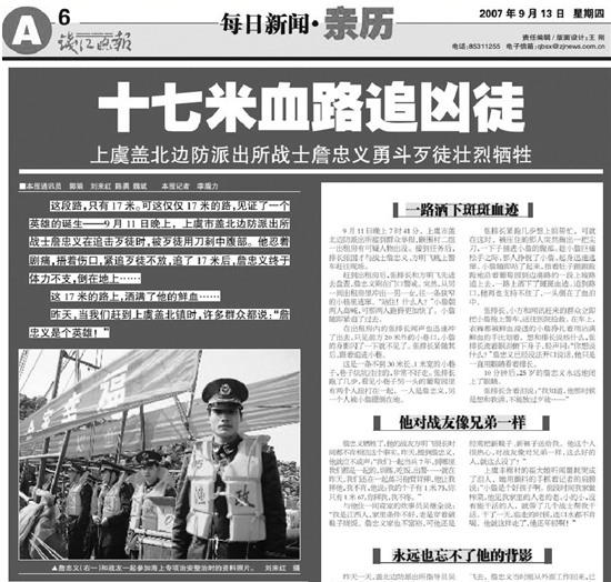 “這段路,只有17米??蛇@僅僅17米的路,見證了一個(gè)英雄的誕生——9月11日晚上,上虞市蓋北邊防派出所戰(zhàn)士詹忠義在追擊歹徒時(shí),被歹徒用刀刺中腹部。他忍著劇痛,捂著傷口,緊追歹徒不放,追了17米后,詹忠義終于體力不支,倒在地上……這17米的路上,灑滿了他的鮮血……”