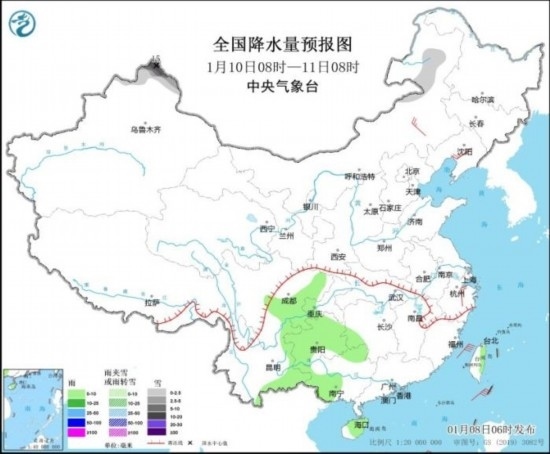 全國(guó)降水量預(yù)報(bào)圖(1月10日08時(shí)-11日08時(shí)) 來(lái)源:中央氣象臺(tái)網(wǎng)站