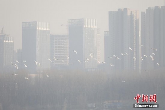 1月11日,河南三門峽,來(lái)自蒙古國(guó)和西伯利亞的數(shù)千只大天鵝前來(lái)越冬。如今,當(dāng)?shù)貞{借適宜的氣候和優(yōu)良的生態(tài)環(huán)境,成為中國(guó)境內(nèi)大天鵝棲息越冬的主要目的地之一。圖為一群天鵝飛過(guò)三門峽城市上空。