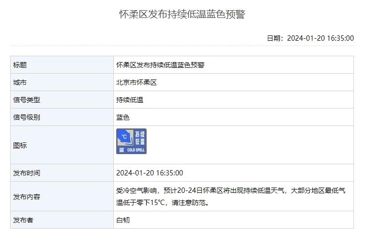 1月20日,北京延慶、懷柔、昌平3區(qū)發(fā)布持續(xù)低溫藍(lán)色預(yù)警。受冷空氣影響,預(yù)計(jì)20—24日這3個(gè)區(qū)將出現(xiàn)持續(xù)低溫天氣,其中延慶、懷柔兩地大部分地區(qū)氣溫低于零下15℃,請(qǐng)注意防范。