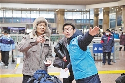 春運(yùn)首日,北京西站內(nèi),中國鐵路北京局志愿者為旅客進(jìn)行引導(dǎo)。本報記者 張武軍攝