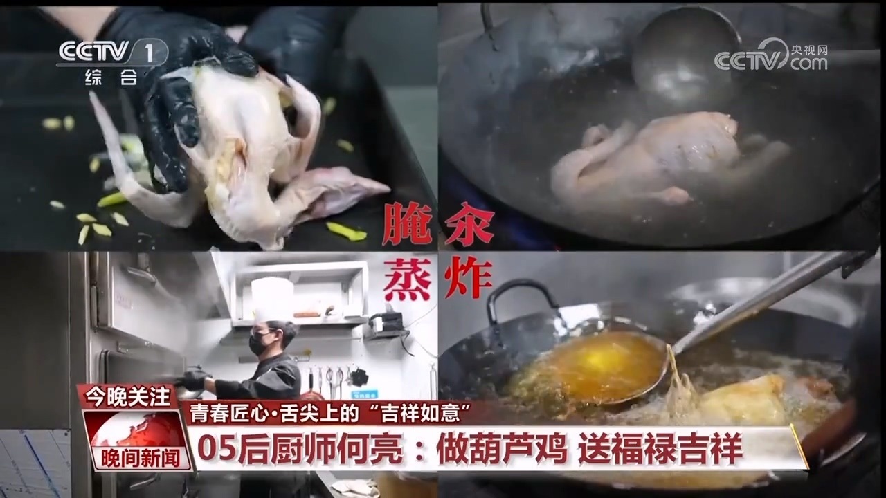 葫蘆雞,是陜菜的代表性菜品之一,相傳始于唐朝并一直流傳至今,因其形似葫蘆而得名,也有諧音“福祿”之意,深受喜愛(ài)。香味濃郁的葫蘆雞,是05后廚師何亮的拿手菜品。