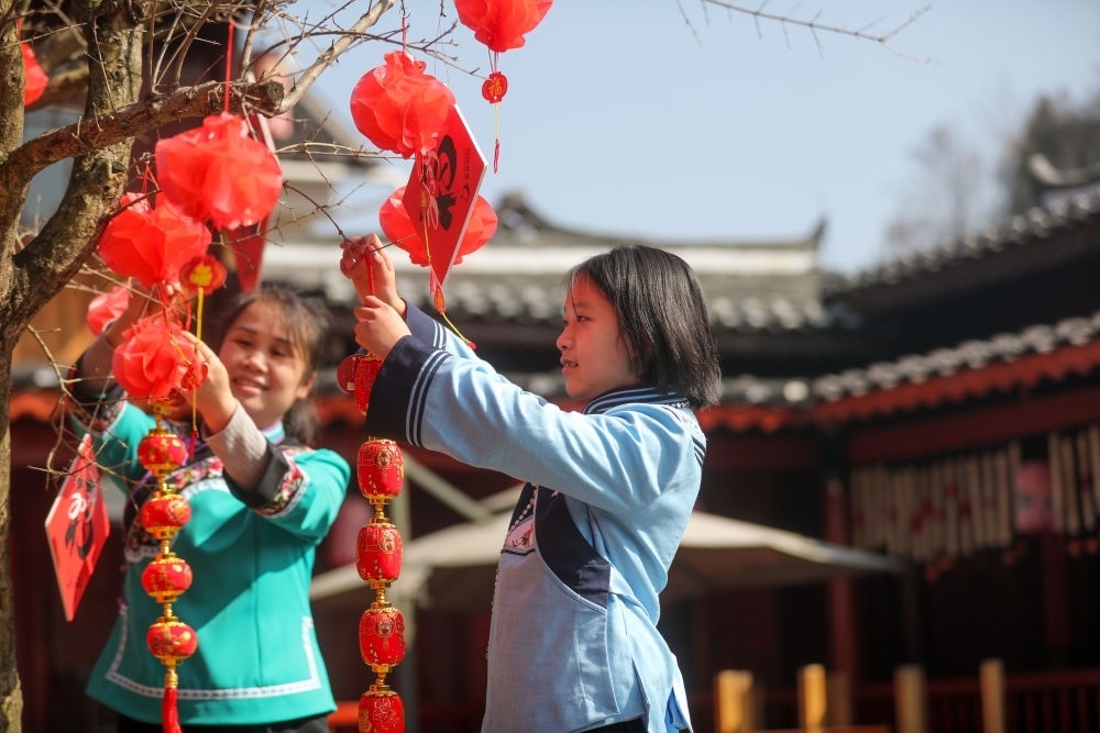 2月10日,在貴州省貴陽市烏當(dāng)區(qū)偏坡布依族鄉(xiāng)偏坡村,出生于2012年的“龍寶寶”韋詩穎 (右)和家人一起在院子里掛新春飾品。新華社發(fā)(袁福洪 攝)