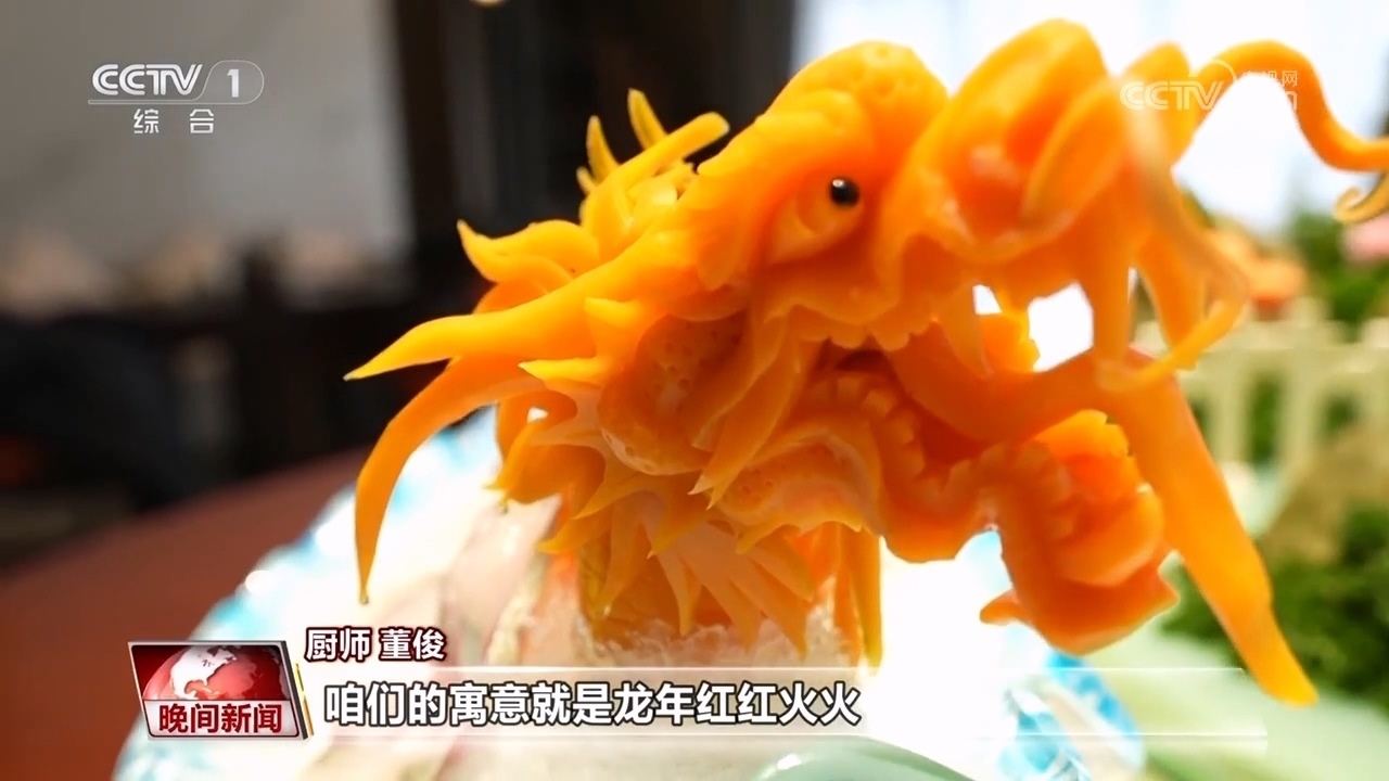 廚師 董俊:把魚切成薄片,用濃湯涮熟,擺盤呈現(xiàn)一條龍的造型,咱們的寓意就是龍年紅紅火火、風(fēng)調(diào)雨順、年年有余。