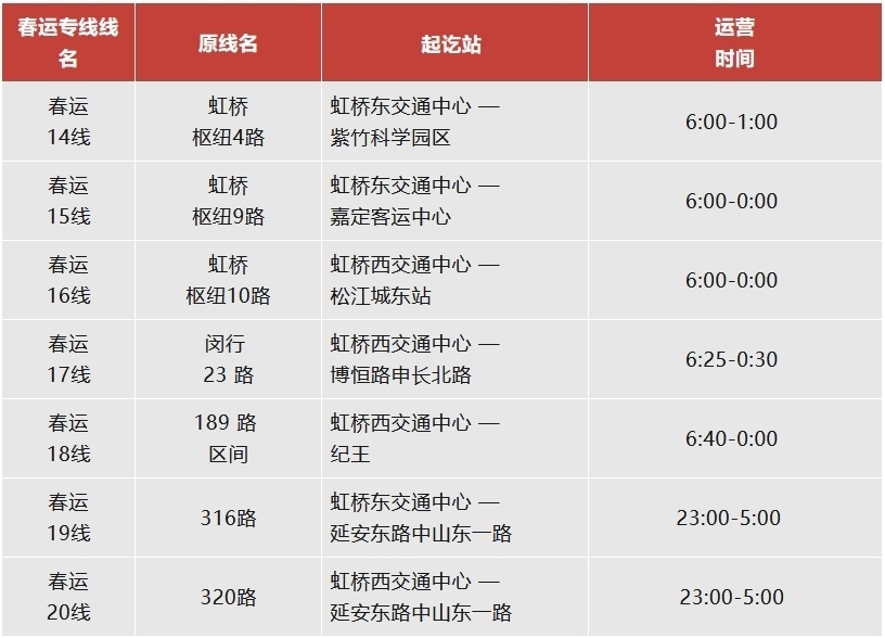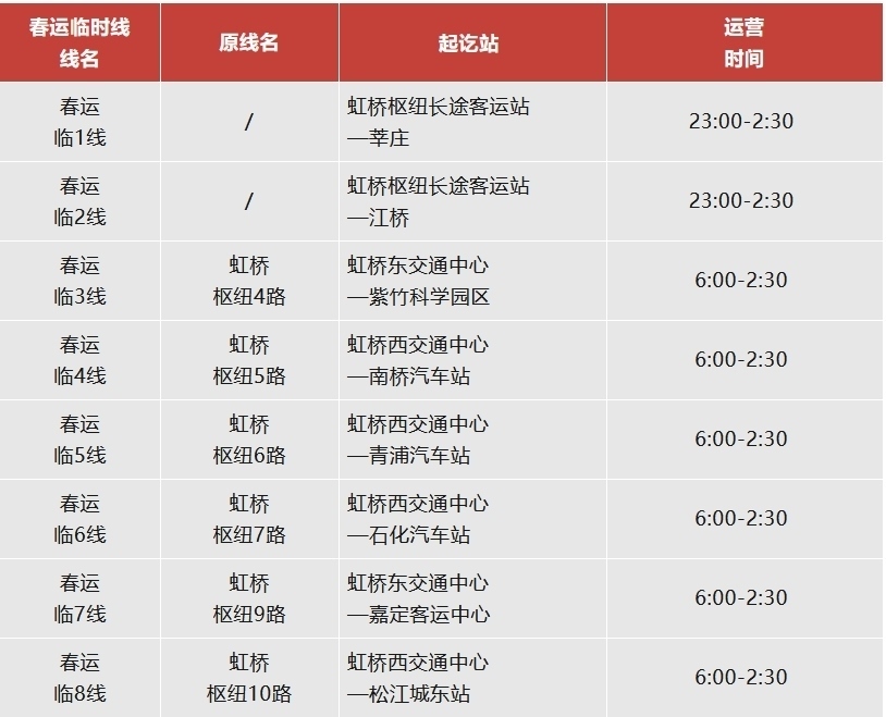注:虹橋樞紐春運(yùn)專線運(yùn)營(yíng)日期為2月14日至3月5日。