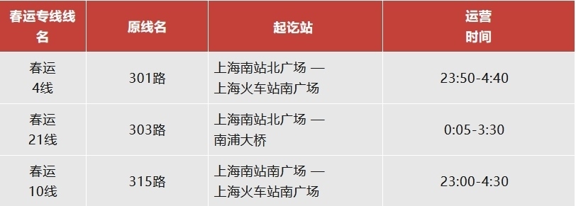 注:上海南站春運(yùn)專線運(yùn)營(yíng)日期為2月14日至3月5日。