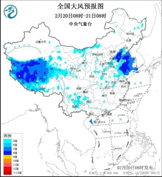 中央氣象臺2月20日6時繼續(xù)發(fā)布大風藍色預警: