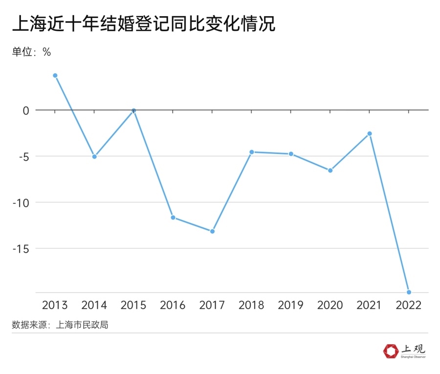 2022年,上海結(jié)婚領(lǐng)證的新人共有7.2萬對,是自1990年以來的最低值。雖說近20年來,結(jié)婚人數(shù)處于波動下降的趨勢,但2022年的降幅不尋常,遠超近十年平均水平(約為5%),相比2021年下降了約20%。