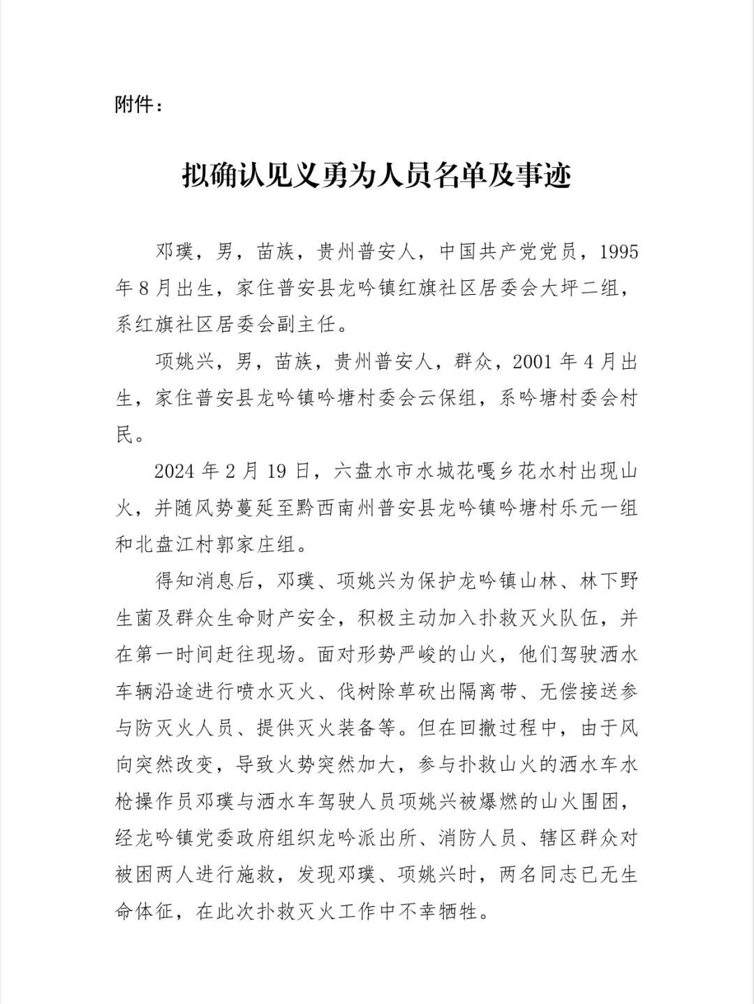 2月23日,普安縣委政法委發(fā)布公示,擬確認(rèn)犧牲的鄧璞(1995年8月出生,紅旗社區(qū)居委會(huì)副主任)、項(xiàng)姚興(2001年4月出生,吟塘村委會(huì)村民)為見(jiàn)義勇為人員。