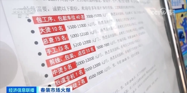 服裝批發(fā)生意的火熱,也帶來了用工需求的增加,不少檔口都貼上了招工的廣告。廣東深圳南油服裝批發(fā)市場批發(fā)商戶 邱林:現在的翻單需求量比較大,大家都在搶工人,現在排單排到快半個月、十幾天,我們店鋪還在招店員。