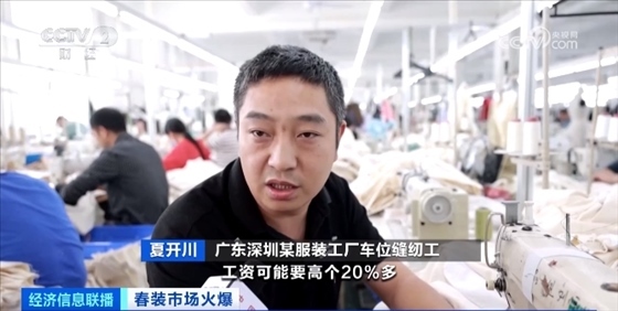 廣東深圳某服裝工廠車位縫紉工 夏開川:比淡季的時候工資可能要高20%多。現在(車位縫紉工)一個月1萬多元。