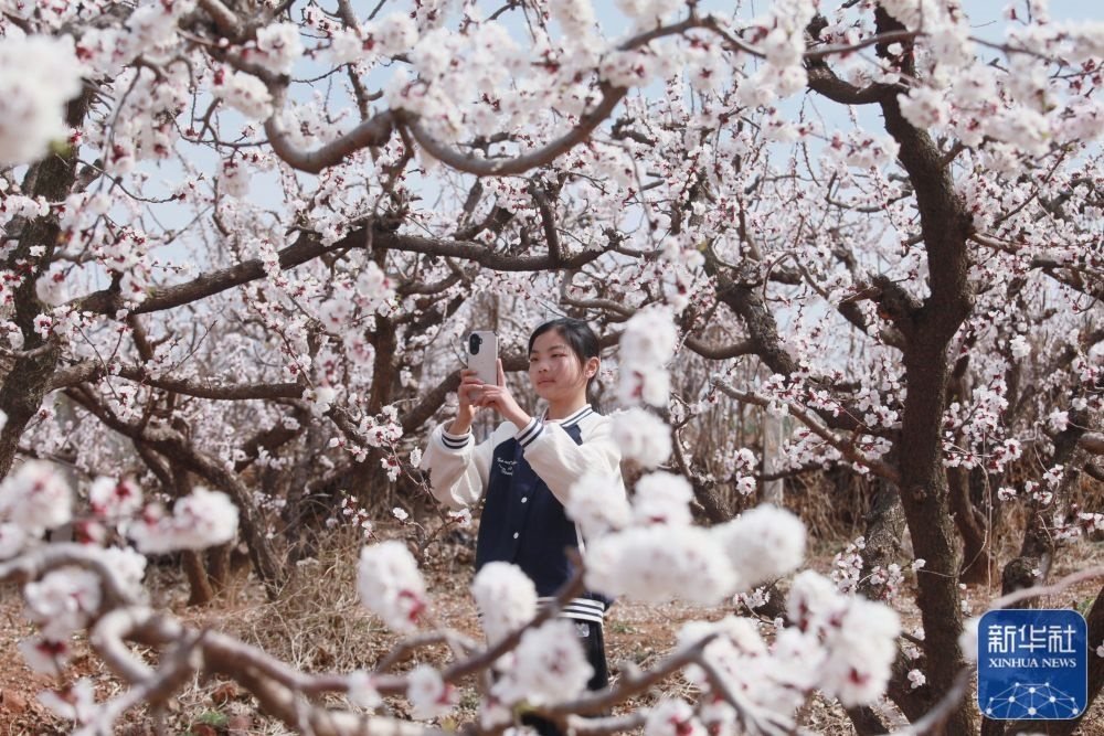 3月23日,游人在山東省臨沂市平邑縣一處杏花園里拍照游玩。新華社發(fā)(武紀(jì)全攝)