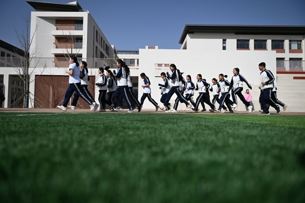 ↑3月29日,北京四中雄安校區(qū)的學(xué)生在操場上跑步。