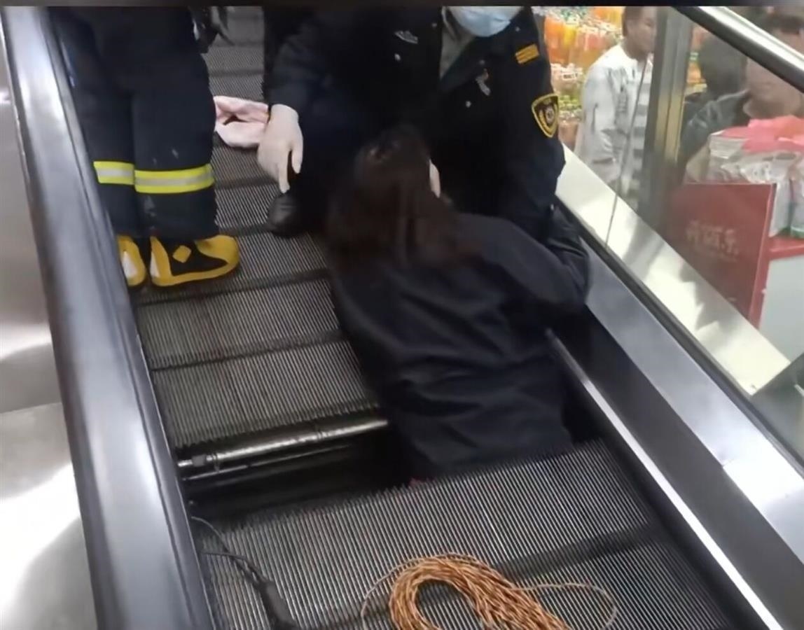 女子被卷入超市內(nèi)扶梯(受訪者視頻截圖)