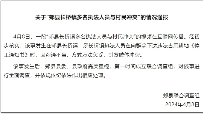 央視網(wǎng)消息:據(jù)“郟縣發(fā)布”公眾號(hào)消息,河南省平頂山市郟縣聯(lián)合調(diào)查組發(fā)布情況通報(bào),4月8日,一段“郟縣長(zhǎng)橋鎮(zhèn)多名執(zhí)法人員與村民沖突”的視頻在互聯(lián)網(wǎng)傳播。經(jīng)初步核實(shí),該事發(fā)生在郟縣長(zhǎng)橋鎮(zhèn),系長(zhǎng)橋鎮(zhèn)執(zhí)法人員在向群眾下達(dá)違法占用耕地《停工通知書(shū)》時(shí),因溝通不當(dāng)、方式方法欠妥,引發(fā)肢體沖突。