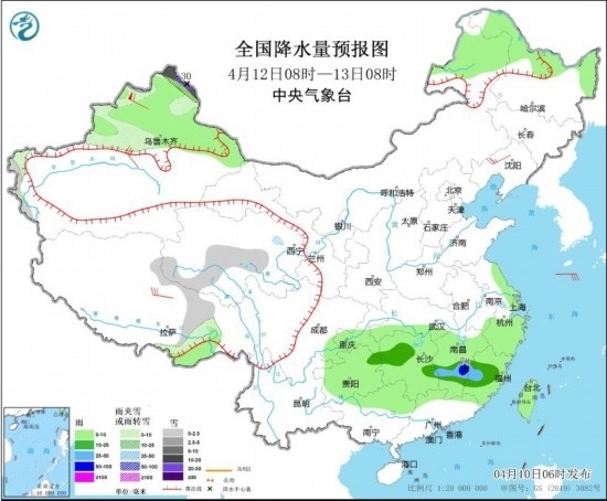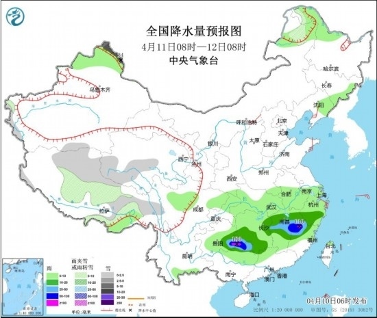 4月11日08時(shí)至12日08時(shí),內(nèi)蒙古東北部、西藏中東部、青海南部、新疆北疆北部等地部分地區(qū)有小到中雪或雨夾雪,其中,新疆北疆北部和北疆東部等地部分地區(qū)有大到暴雪,局地大暴雪(20~24毫米)。貴州東南部、湖南中南部、江西中北部、浙江南部、福建北部、廣西北部等地部分地區(qū)有中到大雨,其中,貴州東南部、湖南西南部、江西東部、福建西北部、廣西東北部等地部分地區(qū)有暴雨或大暴雨(100~180毫米)。內(nèi)蒙古中部、遼東半島、山東半島、浙江北部等地部分地區(qū)有4~5級風(fēng);渤海、渤海海峽、黃海大部海域部分海域?qū)⒂?~7級、陣風(fēng)8級的風(fēng)。
