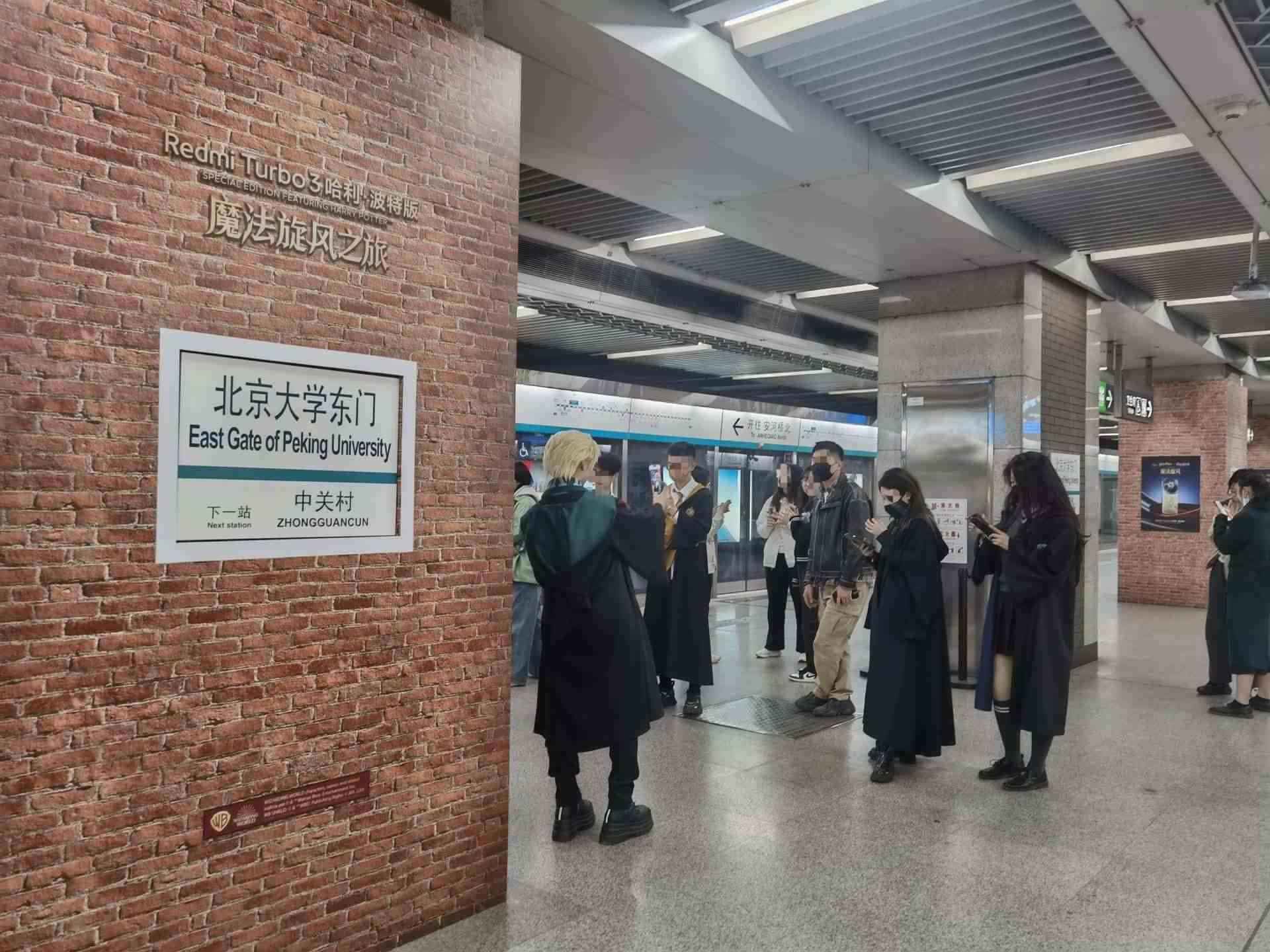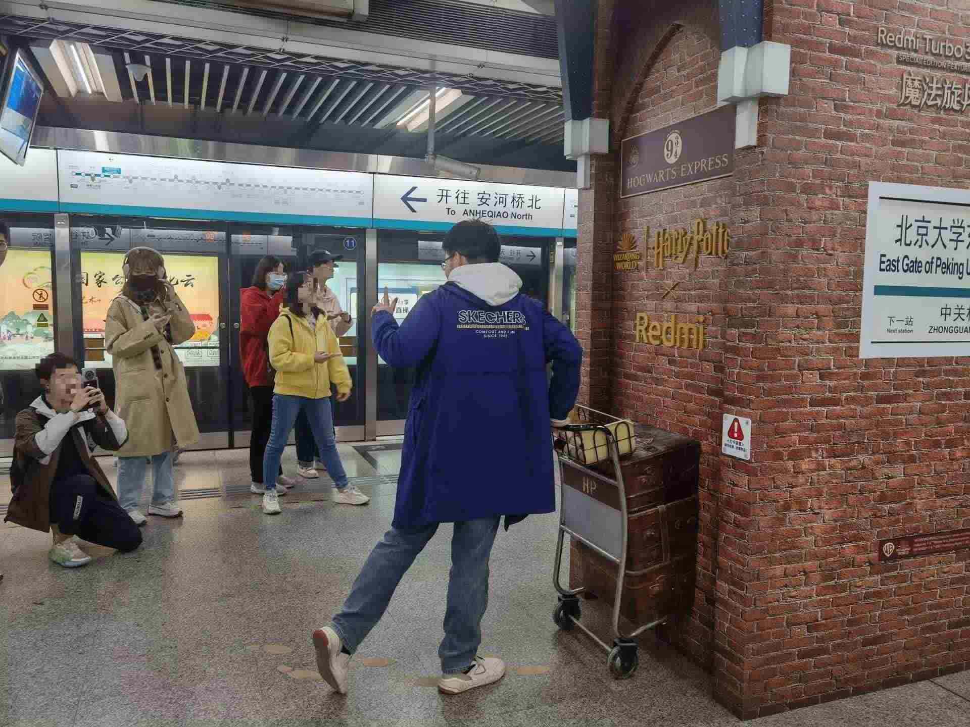 北京大學(xué)東門(mén)地鐵站內(nèi),眾多市民打卡拍照哈利·波特站臺(tái)