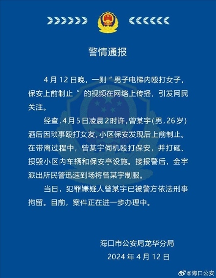 ·男子酒后毆打女友被保安制止,海口警方:犯罪嫌疑人已被刑拘。