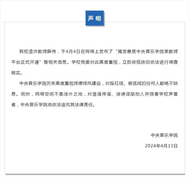 ·中央音樂學院回應學校系主任被舉報:立即調(diào)查,絕不姑息。