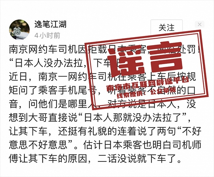 央視網(wǎng)消息:南京網(wǎng)絡(luò)辟謠官微消息,近日,網(wǎng)上流傳“一名日本游客在南京使用網(wǎng)約車服務(wù)時,遭遇司機拒載”的消息,并配有車內(nèi)監(jiān)控畫面。有自媒體捏造稱,南京市交通局發(fā)布了緊急通告,表示將對涉事網(wǎng)約車司機進行嚴(yán)肅處理。一時之間,引發(fā)不少評論和爭議。