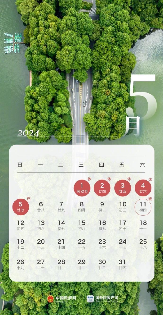 根據(jù)國(guó)務(wù)院辦公廳通知精神,2024年勞動(dòng)節(jié)放假安排為:5月1日(星期三)至5月5日(星期日)放假調(diào)休,共5天。4月28日(星期日)、5月11日(星期六)上班。