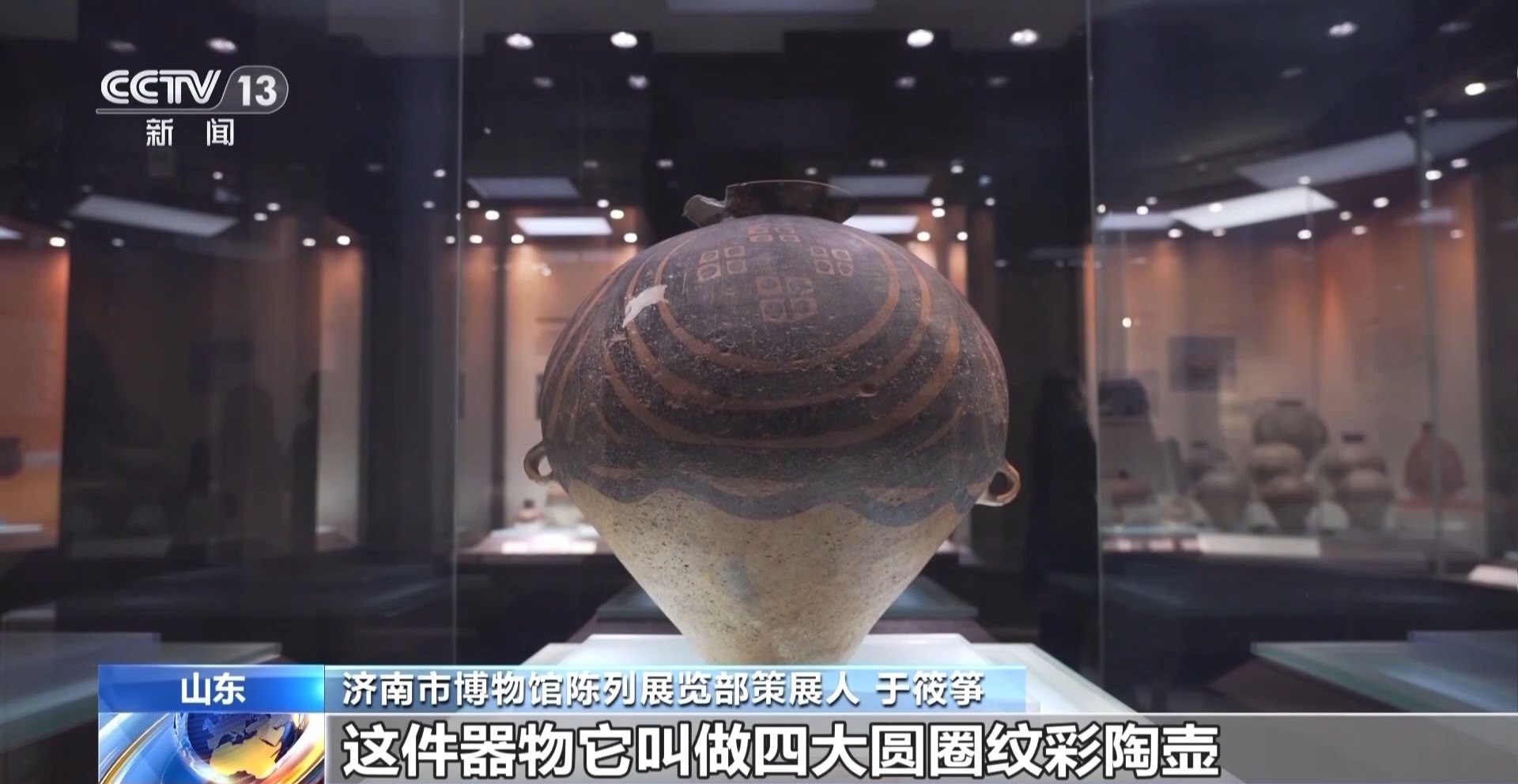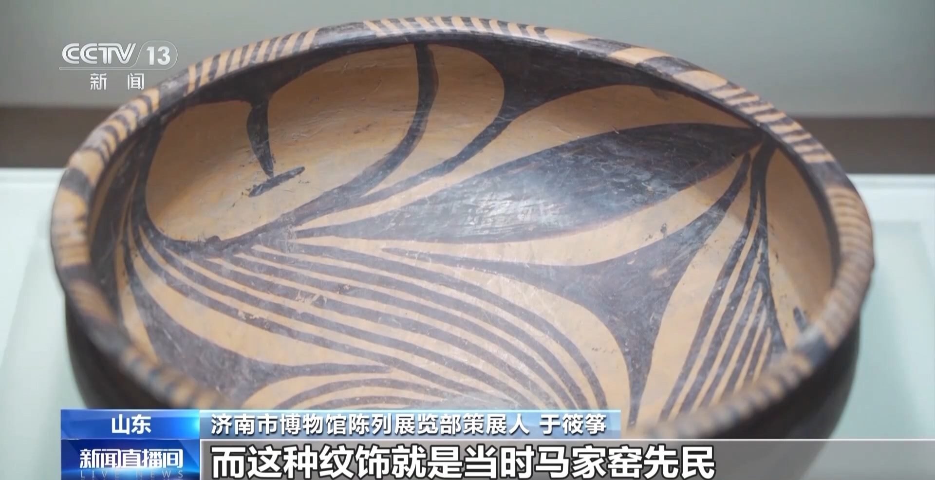 濟南市博物館陳列展覽部策展人 于筱箏:例如我們此次展覽中展出的兩件非常重要的漩渦紋彩陶壺和漩渦紋彩陶盆,其上均是以漩渦紋為主要紋飾,而這種紋飾就是當(dāng)時馬家窯先民對于黃河奔騰河水的一種非常概括,以及極富想象力的描繪,它們也是新石器時代晚期黃河文明形成與發(fā)展的一種重要見證。