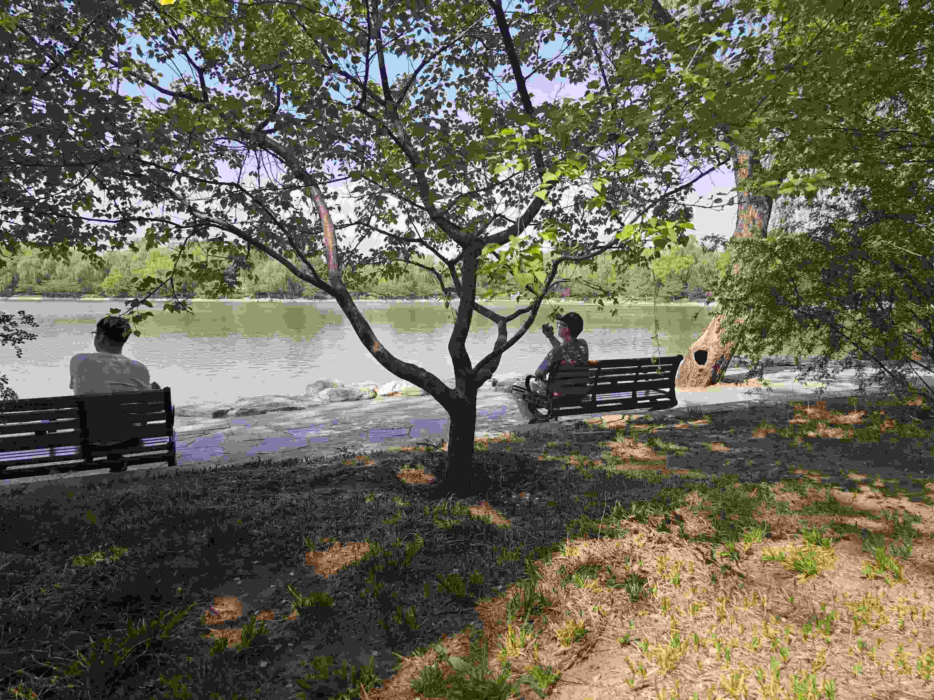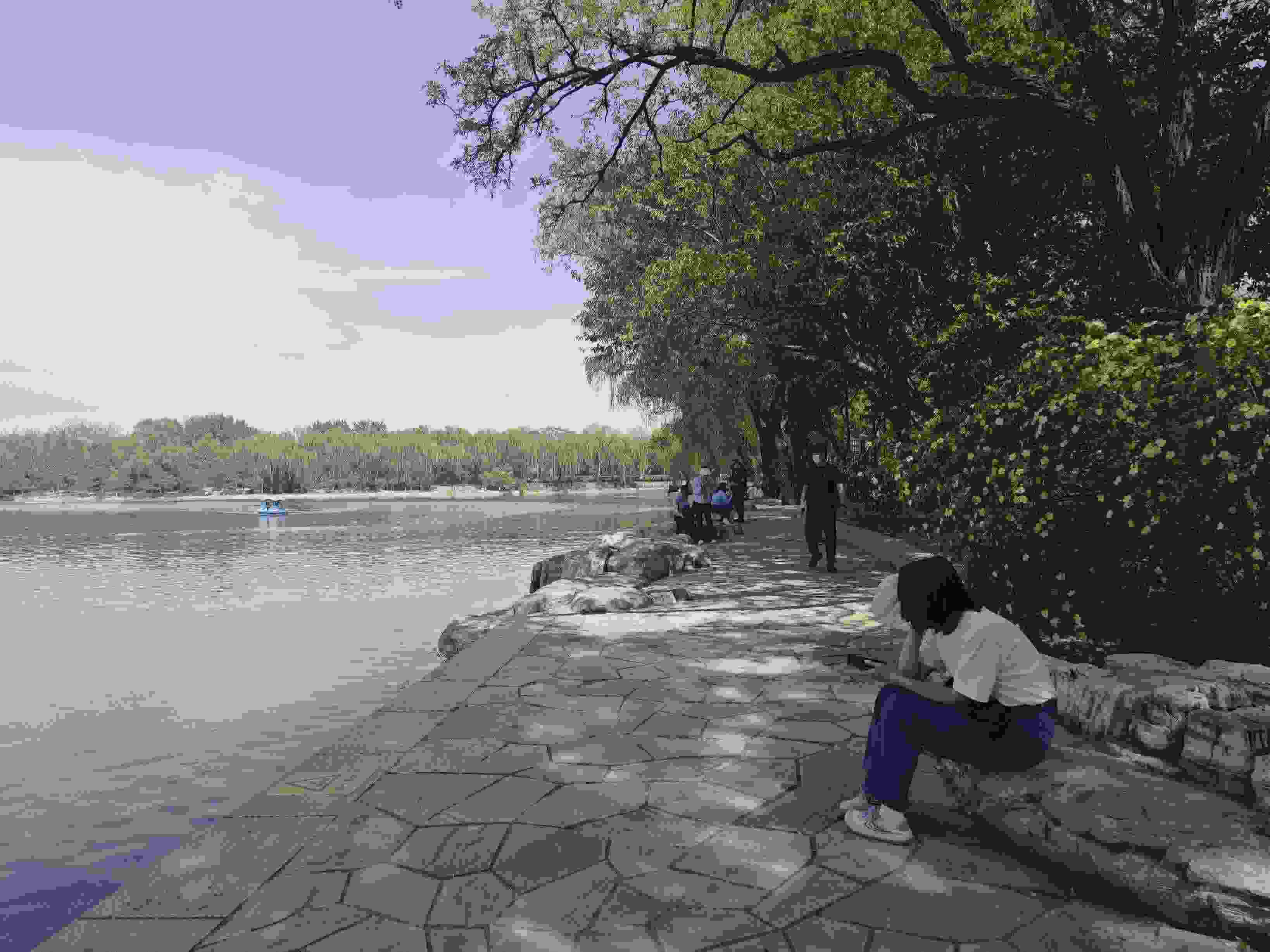工作日午休時(shí)分的玉淵潭公園,也成了上班族的精神“快充站”。玉淵潭公園東湖旁,一排年輕人正悠閑地曬著太陽。眼前的湖面開闊平靜,微風(fēng)拂面,頭頂垂柳依依,耳邊不時(shí)傳來清脆的鳥鳴聲。