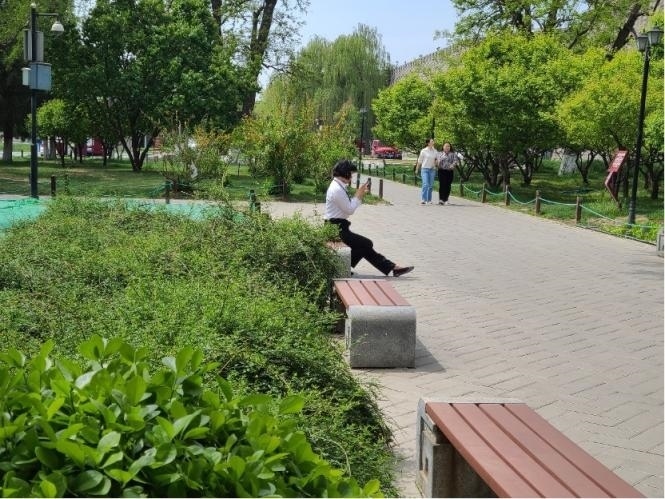 中午1時(shí),走進(jìn)北京明城墻遺址公園,春色襲人。玉棠廣場中,半數(shù)以上的人身著偏正式服裝或佩戴著工牌。他們有的獨(dú)坐小憩,有的兩人結(jié)伴,有的三五成群。在亭廊軒組合處,四位女士圍坐在一起交流生活中的小事,不時(shí)傳出陣陣笑聲。