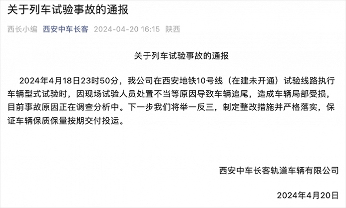 央視網(wǎng)消息:據(jù)西安中車長客官微消息,西安中車長客軌道車輛有限公司4月20日通報(bào),4月18日23時(shí)50分,公司在西安地鐵10號(hào)線(在建未開通)試驗(yàn)線路執(zhí)行車輛型式試驗(yàn)時(shí),因現(xiàn)場(chǎng)試驗(yàn)人員處置不當(dāng)?shù)仍驅(qū)е萝囕v追尾,造成車輛局部受損,目前事故原因正在調(diào)查分析中。下一步將舉一反三,制定整改措施并嚴(yán)格落實(shí),保證車輛保質(zhì)保量按期交付投運(yùn)。
