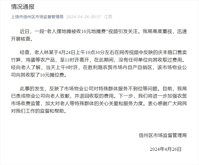 經(jīng)查,老人林某于4月24日上午10點(diǎn)30分左右在網(wǎng)傳視頻中反映的慶豐路口售賣(mài)竹筍、雞蛋等農(nóng)產(chǎn)品,至11時(shí)許離開(kāi),在此期間,沒(méi)有任何單位向其收取過(guò)費(fèi)用。經(jīng)向老人了解,當(dāng)天上午9時(shí)許,在勝利路農(nóng)貿(mào)市場(chǎng)內(nèi)自產(chǎn)自銷(xiāo)區(qū),該市場(chǎng)物業(yè)公司向其收取了10元攤位費(fèi)。