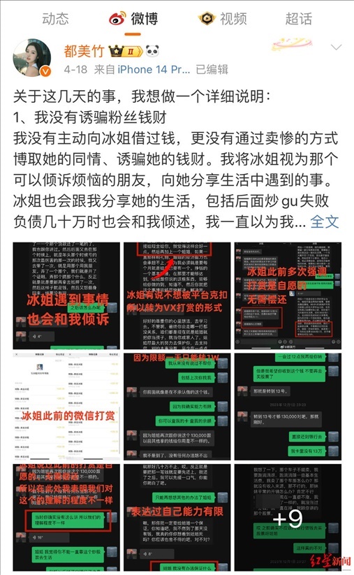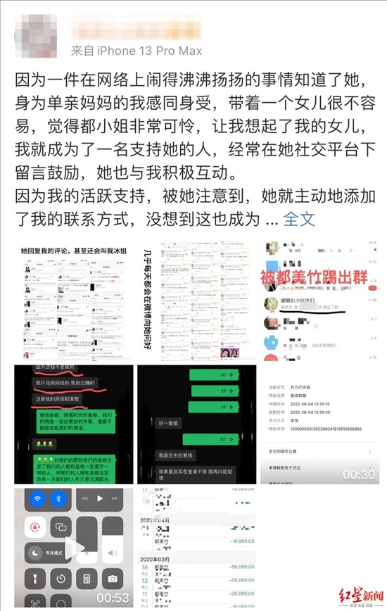 4月15日,都美竹粉絲朱姐發(fā)文稱,她先后給都美竹轉(zhuǎn)款近20萬(wàn)元,現(xiàn)在認(rèn)為都美竹“賣慘”騙錢(qián)。她希望都美竹還錢(qián),但對(duì)方只給她轉(zhuǎn)了3萬(wàn)元。