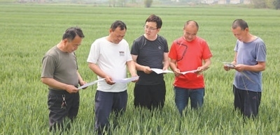 蘇丹(中)在指導村民進行小麥揚花期田間管理。本報記者 原韜雄攝