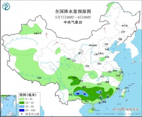 全國降水量預報圖(5月7日08時-8日08時)