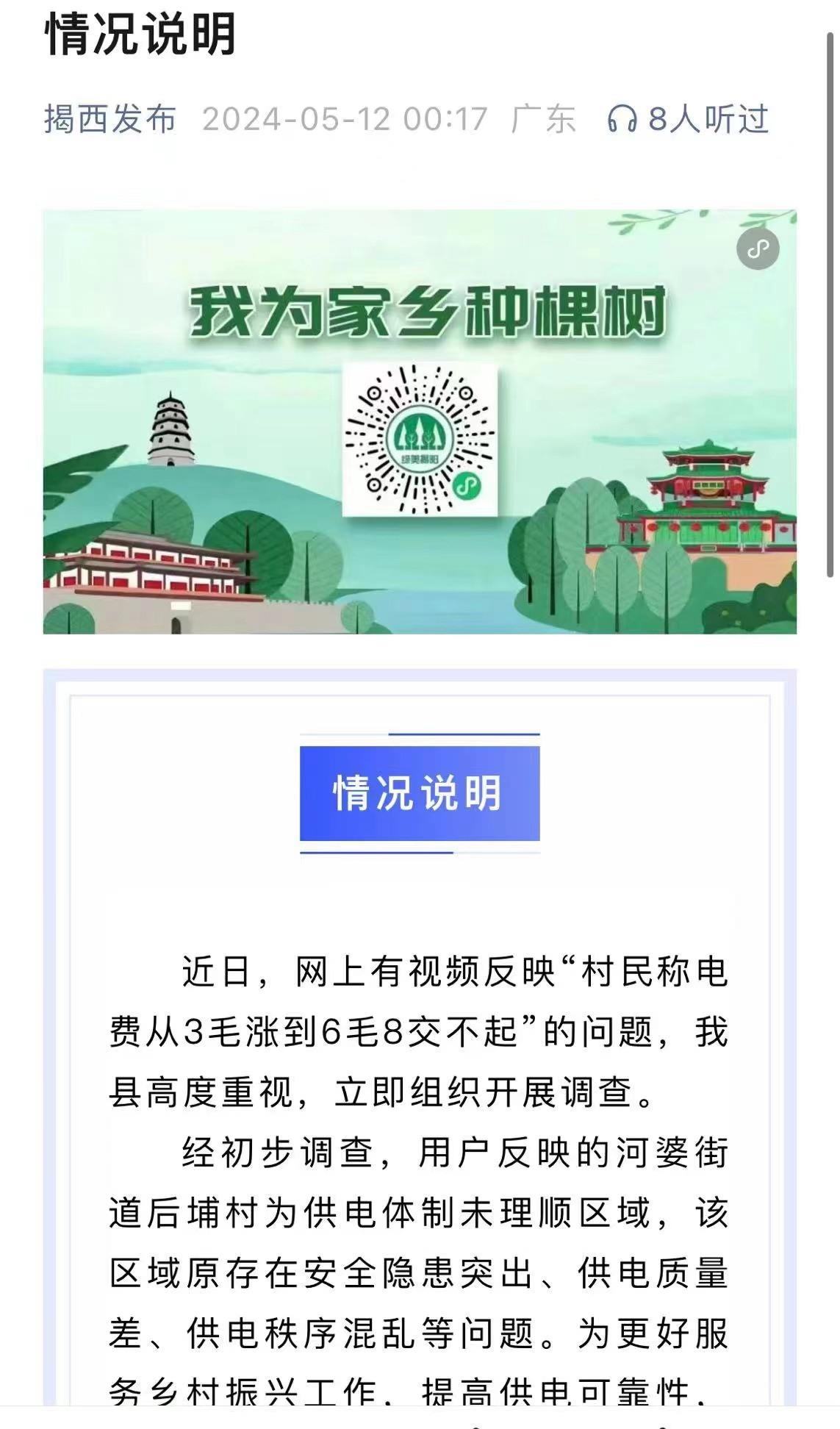 針對此事,“揭西發(fā)布”微信公眾號于5月12日發(fā)布了情況說明,表示對網(wǎng)上反映的“村民稱電費(fèi)從3毛漲到6毛8交不起”的問題高度重視,并已立即開展調(diào)查。