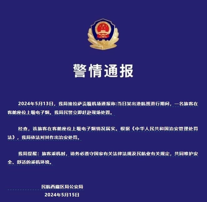 央視網(wǎng)消息:據(jù)民航西藏自治區(qū)管理局公眾號消息,5月15日,民航西藏區(qū)局公安局發(fā)布警情通報稱,5月13日,拉薩貢嘎機場某出港航班滑行期間,一名旅客在客艙座位上吸電子煙,民航西藏區(qū)局公安局民警立即趕赴現(xiàn)場處置。