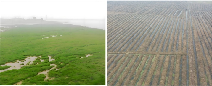 拼版照片:左圖為南洞庭湖自然濕地景觀(資料圖片),右圖為南洞庭湖挖溝抬壟現(xiàn)狀。(督察組供圖)
